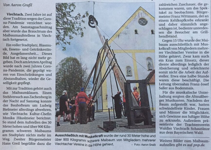 30 Meter hoher Maibuam wurde am Viechtacher Stadtplatz aufgestellt