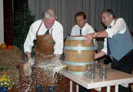 Ganz schön spritzig ging’s zu beim Oktoberfest, zu dem der Viechtacher Handwerkerverein am Samstagabend wieder in die Stadthalle eingeladen hatte. Dafür verantwortlich war Bürgermeister Georg Bruckner, der beim Anzapfen einen „Schlag mit Folgen“ setzte, wie unser Bild zeigt. Doch der Brauerschurz verhinderte Schlimmeres und die beiden Vorstände Franz Wittmann (Mitte) und Heinz Pledl hatten sich vorsichtshalber schon hinter dem Bierfass platziert. Auch wenn die Stadthalle nicht voll besetzt war, freute sich Vorstand Franz Wittmann über den Besuch vieler Ortsvereine und befreundeter Handwerkervereine. Zum frischen Bier und guten Essen servierte die Viechtacher Stadtkapelle schönste Blasmusik.